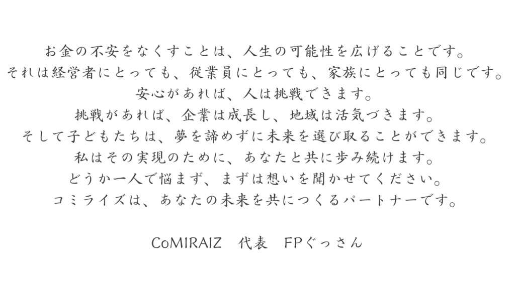 CoMIRAIZ(コミライズ)は企業と働く人がともに成長し、ウェルビーイングな人生を歩める社会を目指すFPオフィスです。
